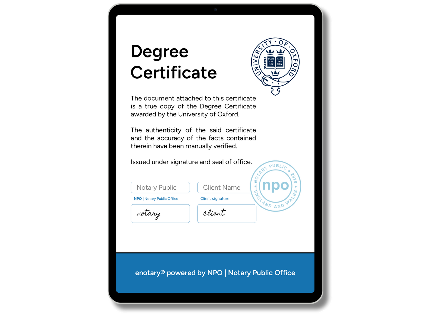 Before attesting the authenticity of academic documents the Notary must verify the qualification with the awarding body and the student's identity.